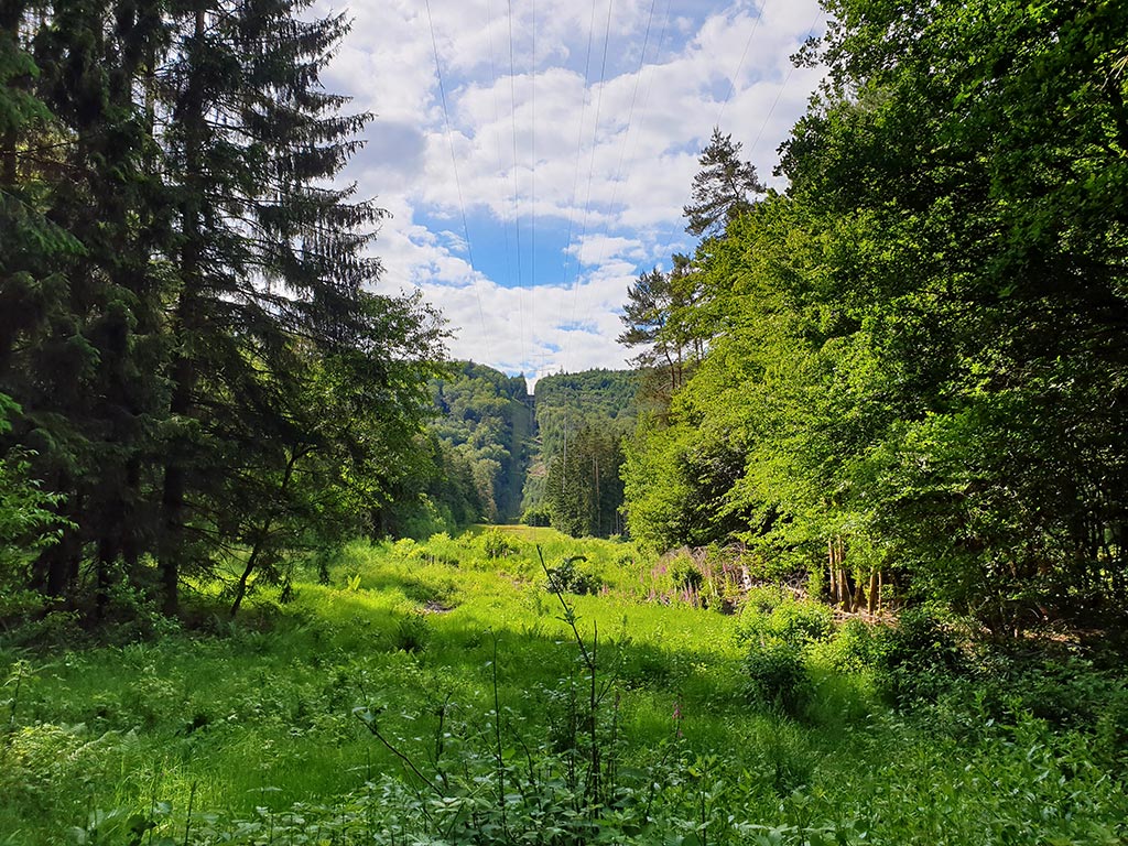 - Einstieg: Links von der Grillhütte führt ein Weg in den Wald